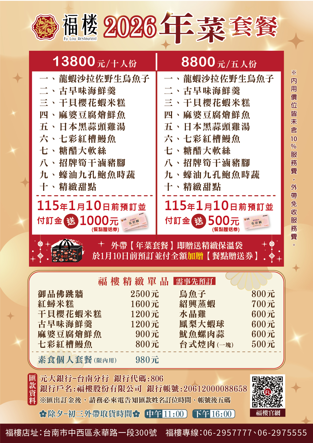 福樓【2026年菜 11月5日起開放訂位】歡迎來電洽詢!!