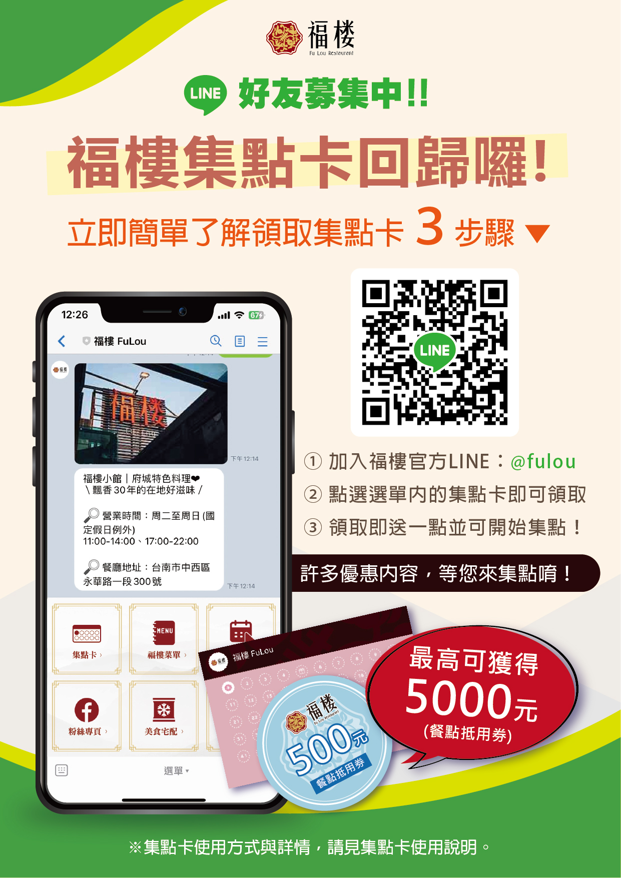 現在只要加入福樓官方LINE帳號 @fulou,領取集點卡即可獲得1點~